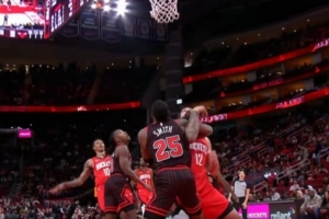 GIF-火箭挑战出界球权,但失败,补吹亚当斯抢篮板犯规