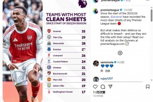 同期,排名第二的是曼城,他们有29场比赛零封,上赛季夺冠的利物浦则是有26场比赛零封,排名第五。