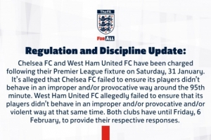 英足总发布监管与纪律更新公告:针对1月31日周六英超联赛中的行为,切尔西足球俱乐部与西汉姆联足球俱乐部已遭到指控。