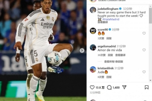 贝林厄姆社媒晒出比赛照片,配文:“在这里比赛从来都不轻松,但以一场苦战拿下三分,开启新的一周。”