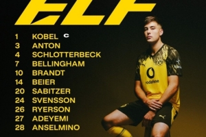 多特蒙德首发:1-科贝尔、3-安东、4-施洛特贝克、7-乔布-贝林厄姆、10-布兰特、14-拜尔、20-萨比策、24-斯文松、26-莱尔森、27-阿德耶米、28-安塞尔米诺