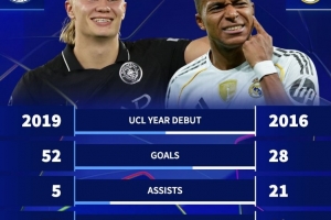 体育资讯10月2日讯 本轮欧冠,曼城2-2战平摩纳哥,哈兰德在第50次欧冠出场梅开二度。德转也盘点了目前足坛两大前锋哈兰德、姆巴佩在前50场欧冠数据,具体如下:
