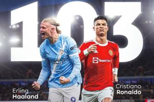 至此,哈兰德在英超的进球已经来到103粒,这追平了C罗在英超的进球数。