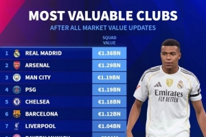 俱乐部德转身价排名:皇马13.8亿欧居首,阿森纳12.9亿欧次席